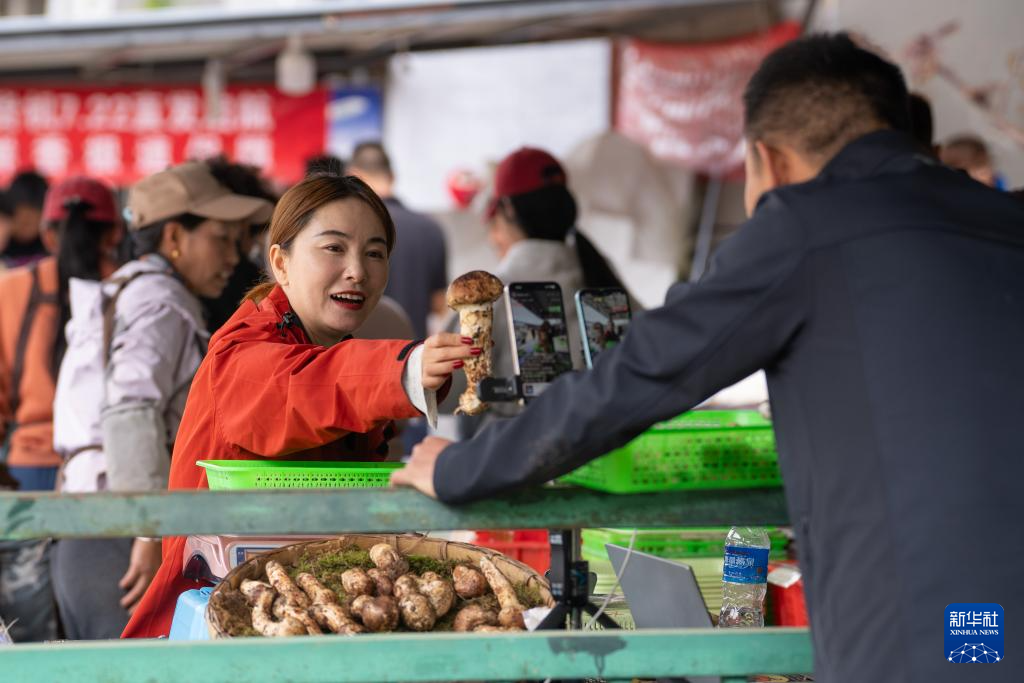 7月24日,一名主播在香格里拉市松茸交易市场直播推介松茸。