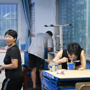 7月28日,集中安置群众在天津市蓟州区下营镇初级中学吃泡面。