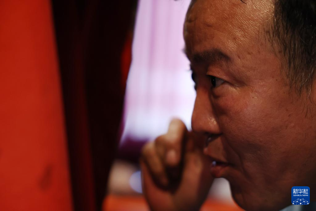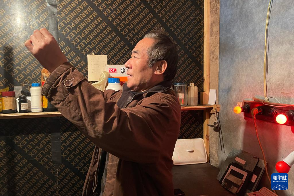 魏伟的父亲魏洁雄在阿干照相馆的暗房里查看冲印好的底片(2023年12月9日摄)。