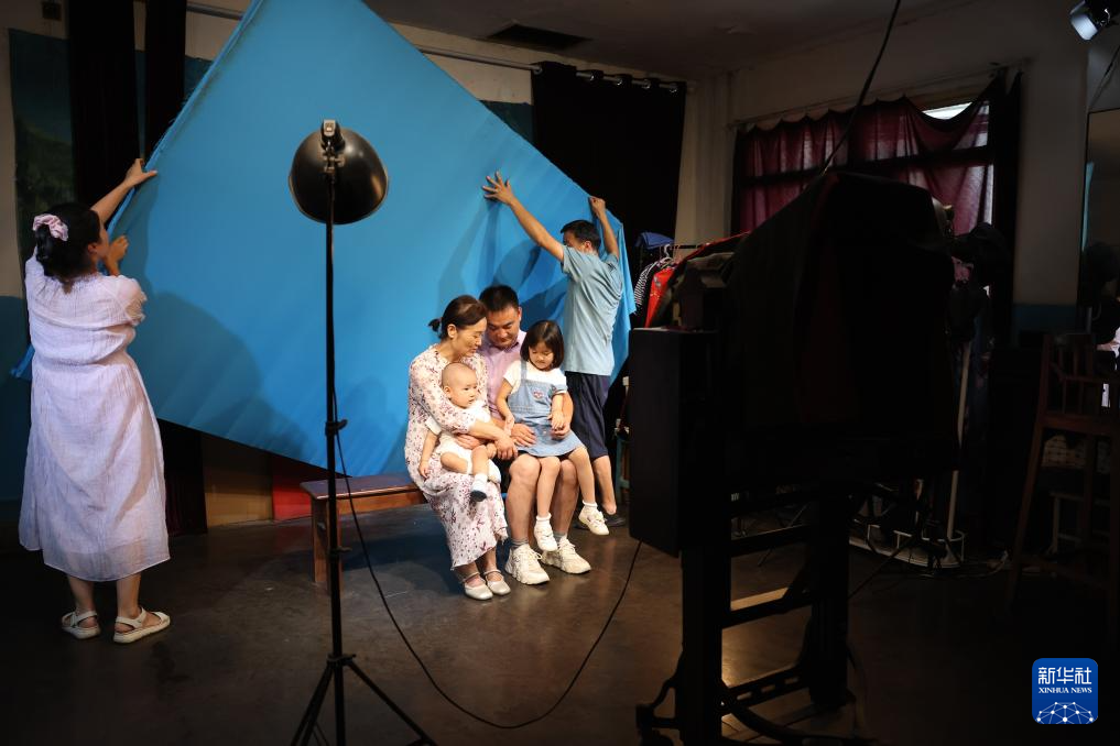 7月29日,魏伟(右一)在阿干照相馆里挪动背景板,准备为几位专门赶来拍照的西安游客拍摄全家福。