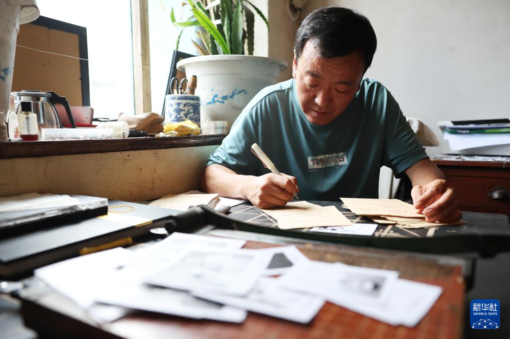 7月29日,魏伟在阿干照相馆里裁切照片。