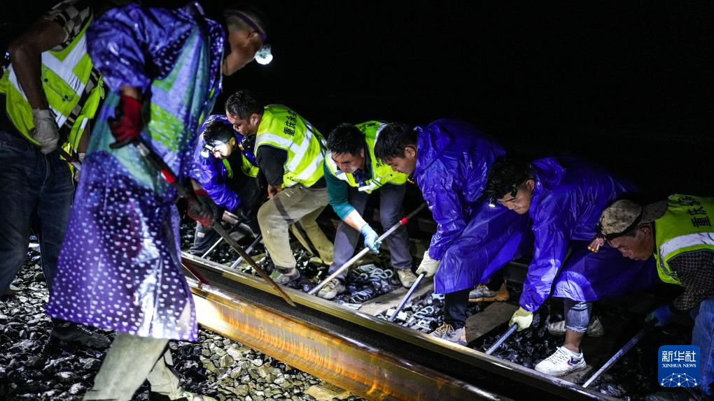 7月30日,工人在内六铁路六盘水梅花山路段进行整修作业。