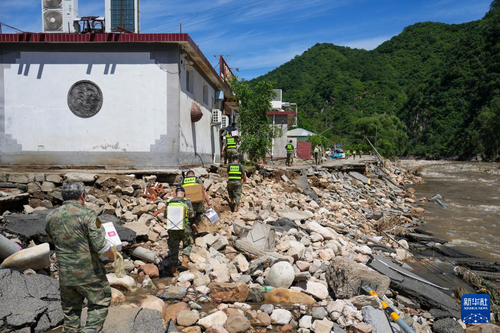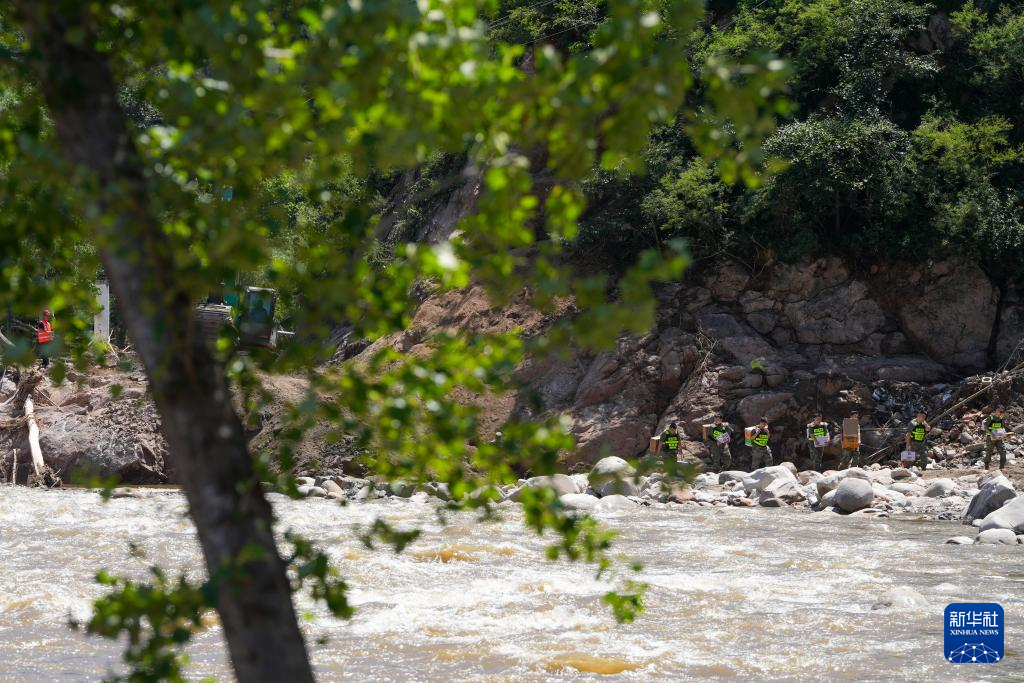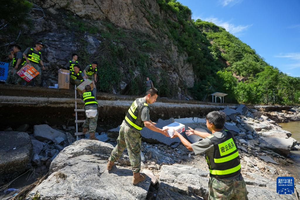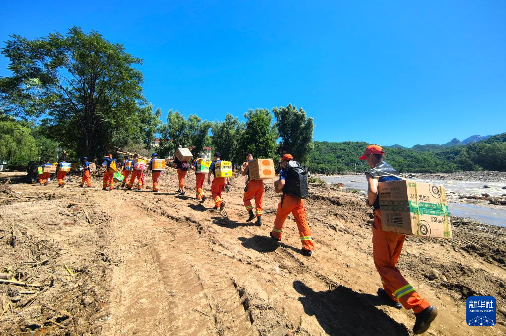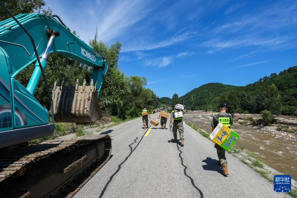 7月30日,在密云区冯家峪镇,密云区消防救援支队的救援人员为道路被阻断的村庄运送生活物资。