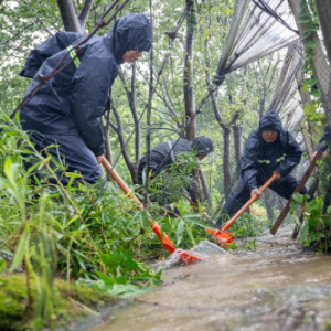 7月30日,在浙江省湖州市长兴县夹浦镇长平村一处葡萄基地,党员志愿者、民兵帮助农户排水通渠。