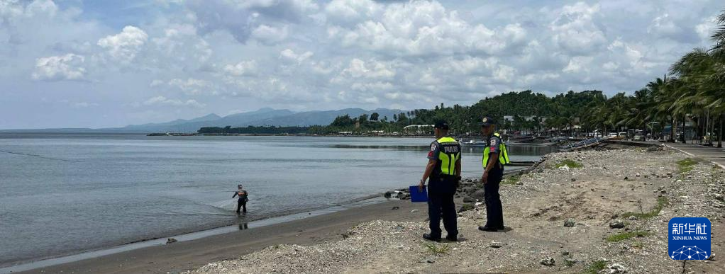 7月30日,菲律宾阿尔拜省黎牙实比市警方人员在海岸开展巡逻监控。