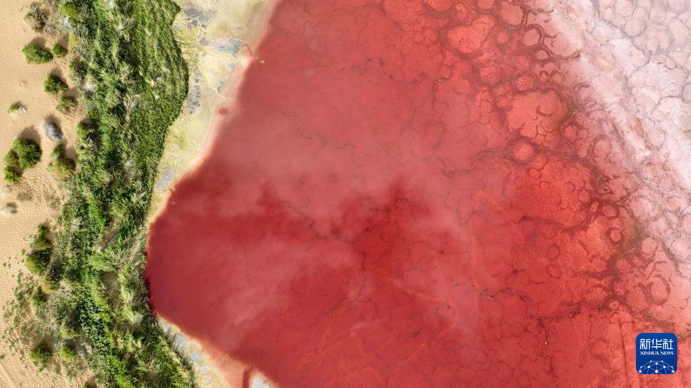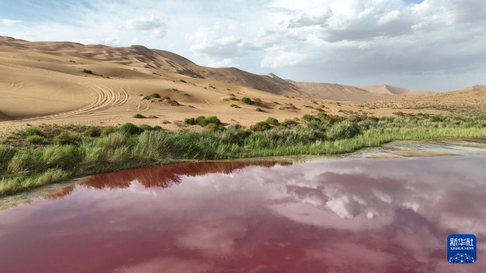 2024年7月30日在内蒙古阿拉善盟阿拉善右旗拍摄的巴丹吉林沙漠中的红海子(无人机照片)。
