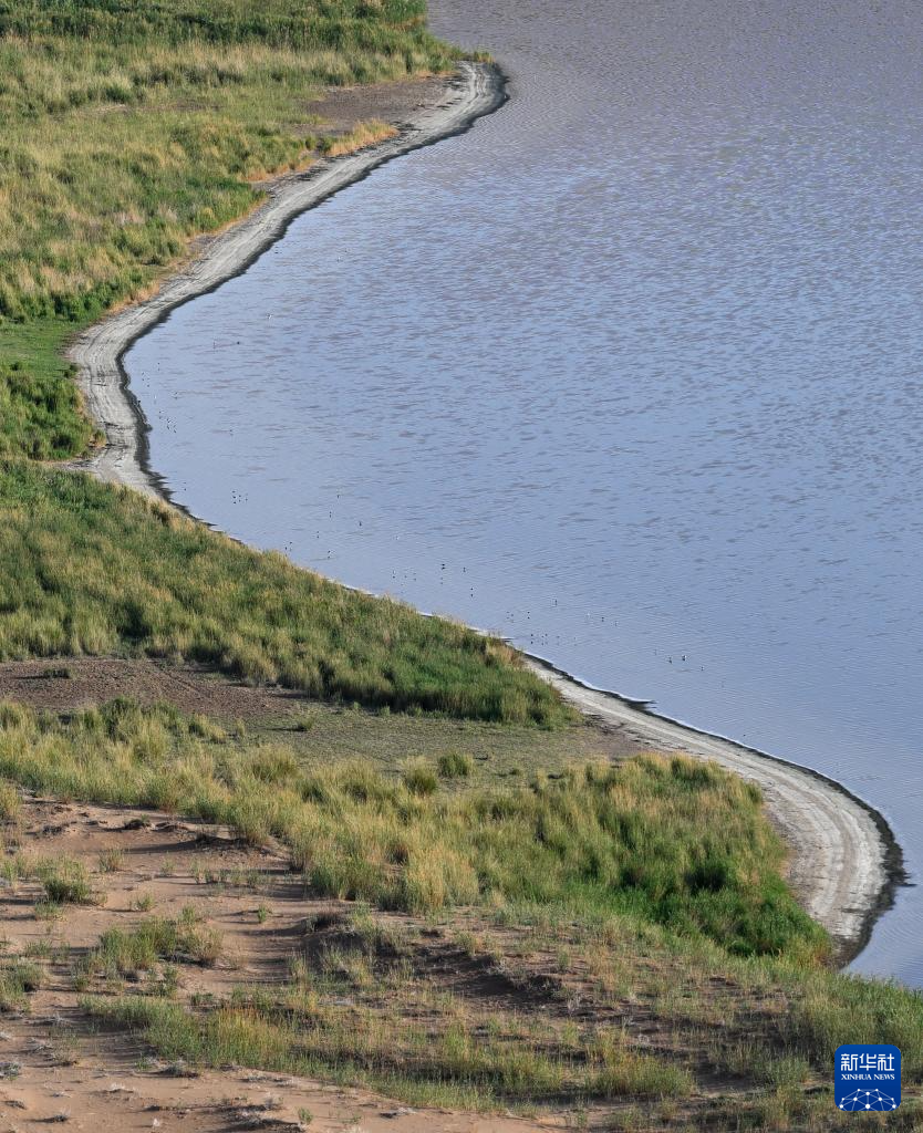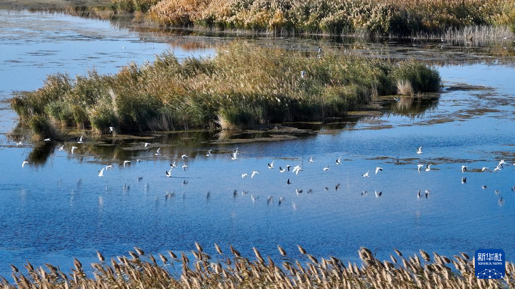 2024年10月14日在内蒙古阿拉善盟额济纳旗拍摄的居延海景区(无人机照片)。