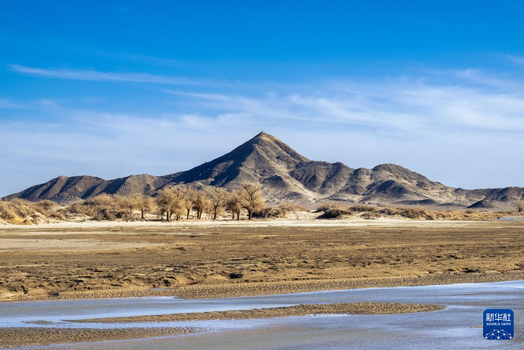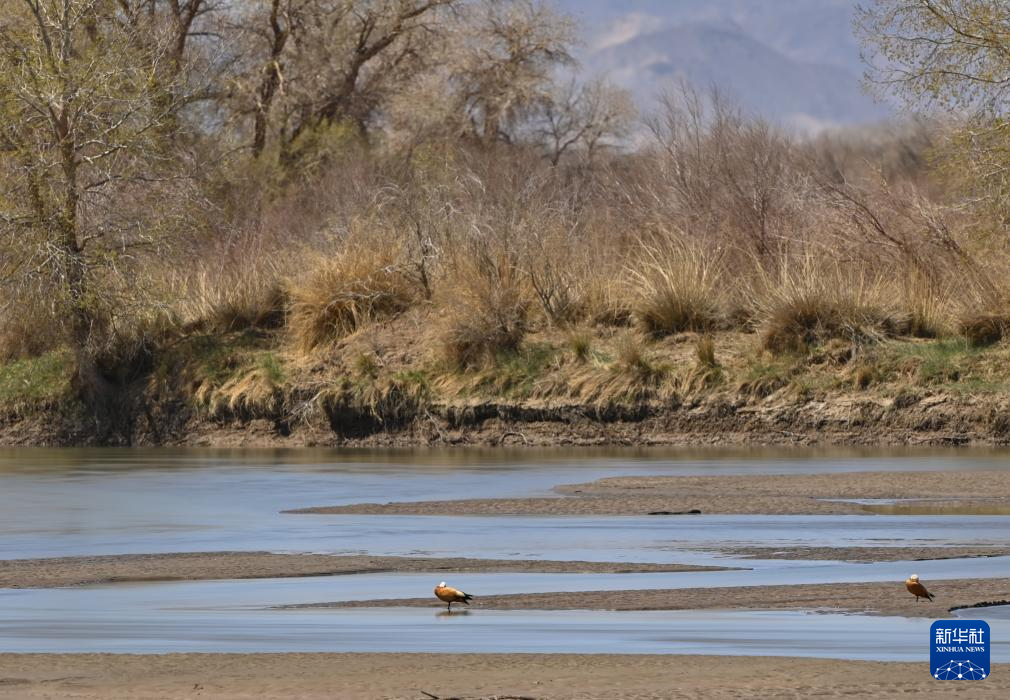 2025年4月22日在内蒙古阿拉善盟额济纳旗拍摄的弱水河与狼心山风光。