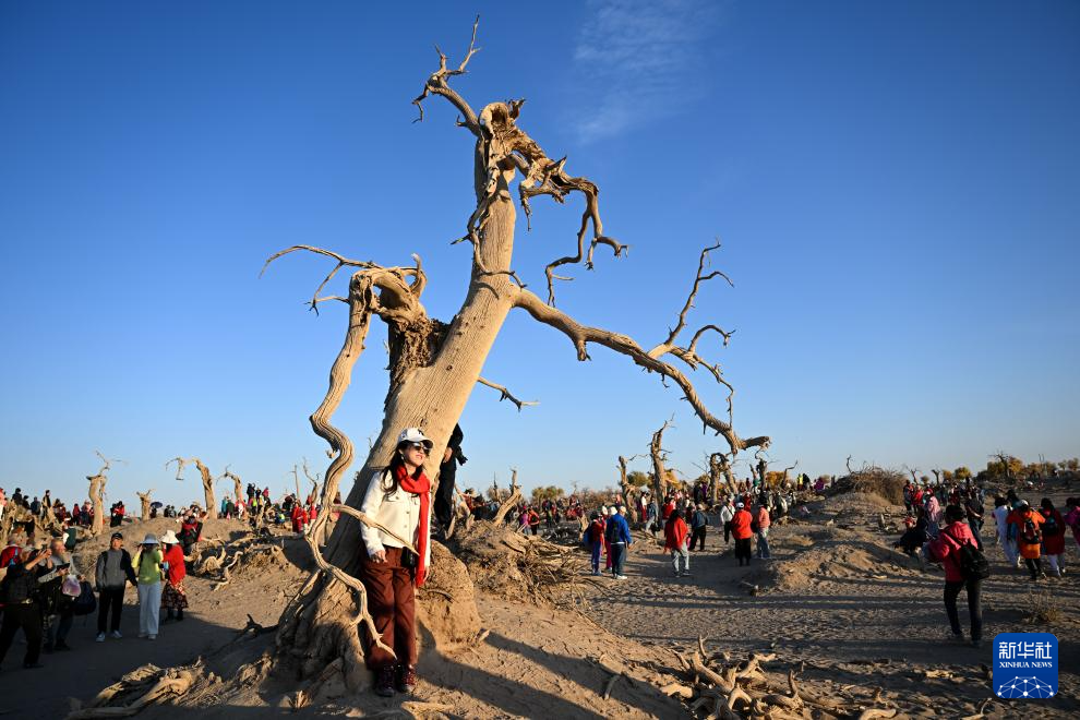 2024年10月14日,游客在内蒙古阿拉善盟额济纳旗怪树林景区游玩。