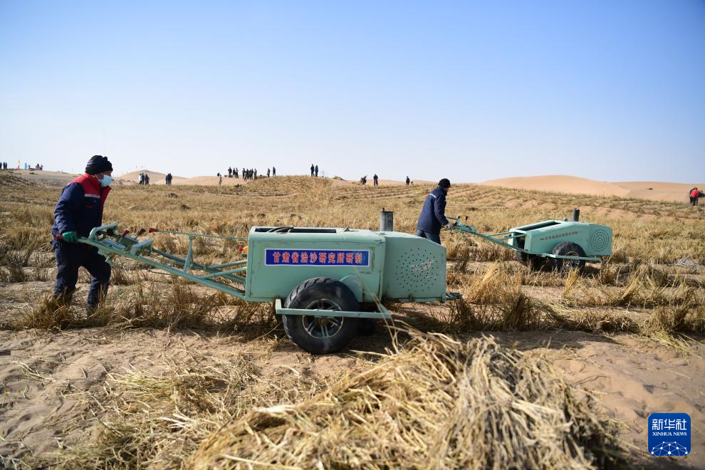 2025年2月28日,在内蒙古阿拉善盟巴丹吉林和腾格里两大沙漠交汇处的阿拉善九棵树项目区,治沙工人使用压草机扎草方格。