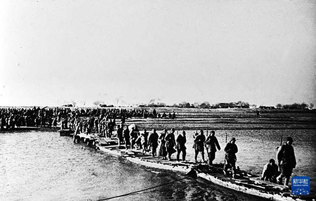 1945年9月,新四军参加淮阴战役的部队通过运河浮桥(资料照片)。