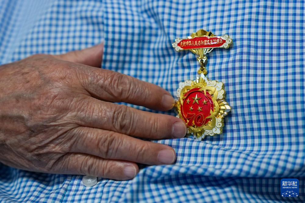 2025年7月11日,王生用手抚摸“庆祝中华人民共和国成立70周年”纪念章。