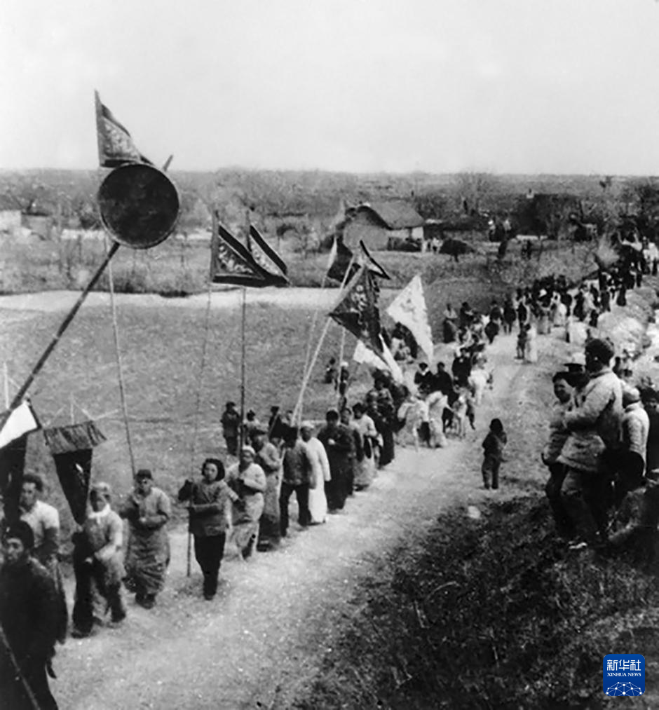 1943年冬,在苏北抗日根据地,群众纷纷将自己的子弟送到新四军中(资料照片)。