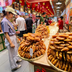 7月30日,游人在什刹海旁的烟袋斜街游览。