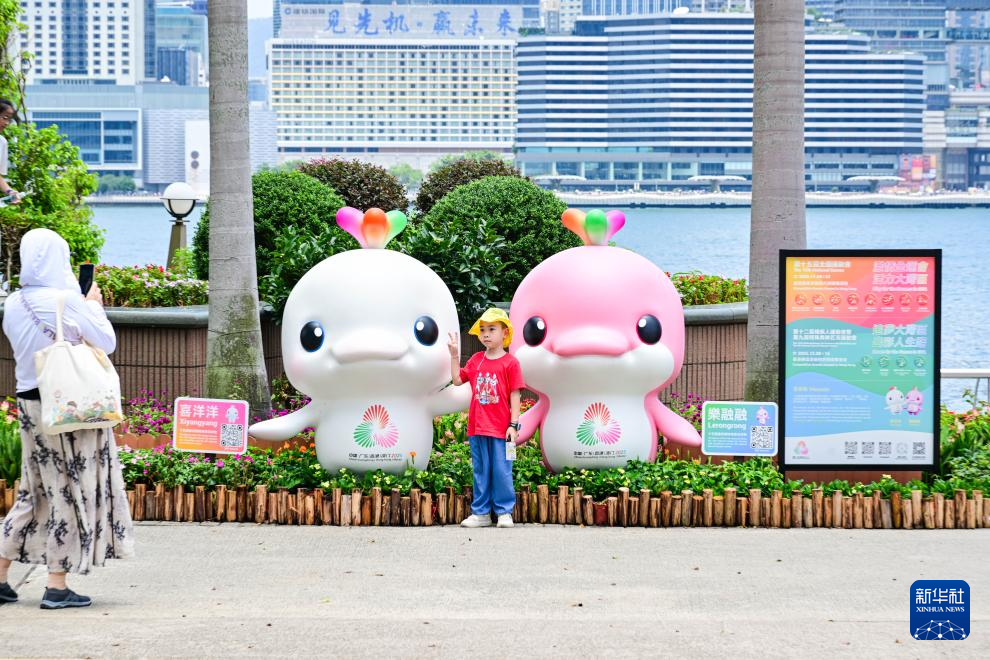 8月1日,一名儿童在香港金紫荆广场的第十五届全国运动会吉祥物旁留影。