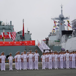8月1日,在俄罗斯符拉迪沃斯托克某军港,参加中俄“海上联合-2025”联合演习的中俄双方官兵整齐列队。