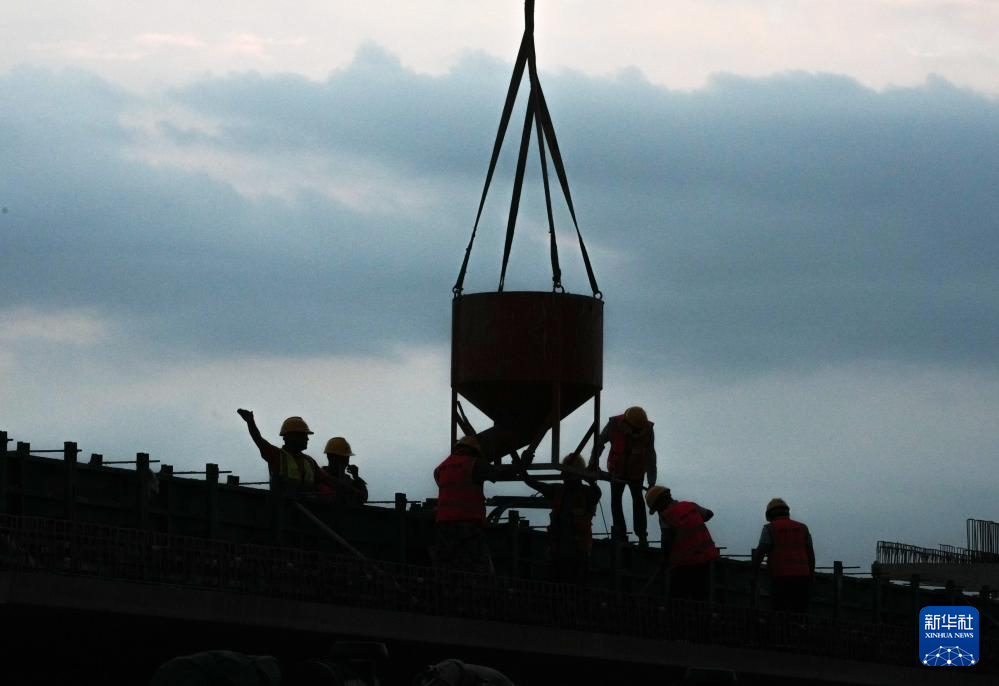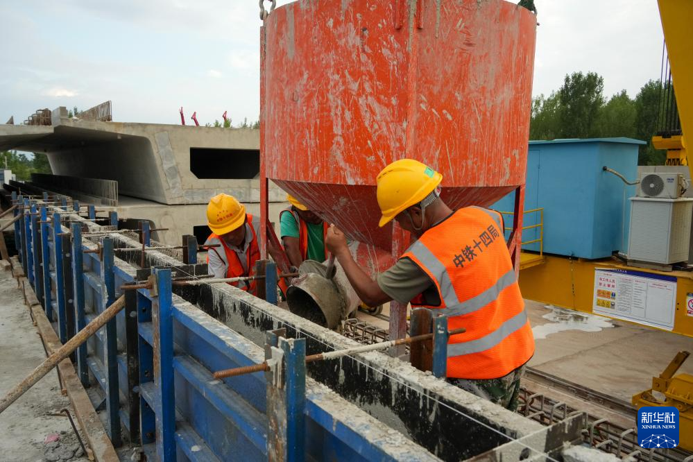 7月31日,在潍宿高铁安丘渠河特大桥施工现场,中铁十四局工作人员进行施工作业。
