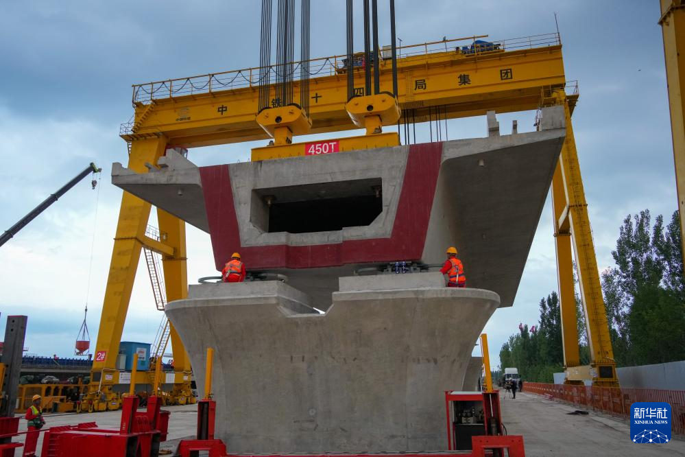 7月31日,在潍宿高铁安丘渠河特大桥施工现场,中铁十四局工作人员在进行箱梁架设作业。
