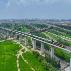 8月2日,检测列车在进行联调联试作业(无人机照片)。