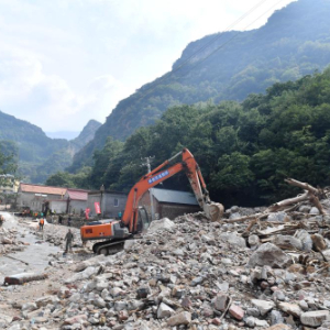 8月1日,在兴隆县六道河镇朱家沟村,工作人员驾驶工程车辆清理石块。