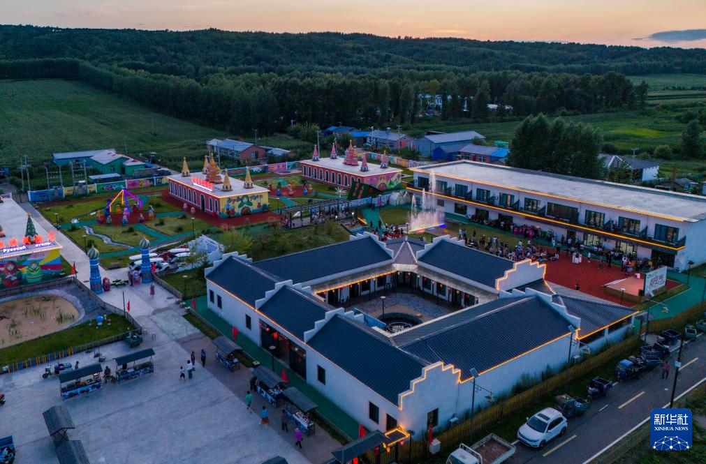 这是7月22日拍摄的夕阳下的嘉荫县向阳乡雪水温村鱼米乡里民宿(无人机照片)。