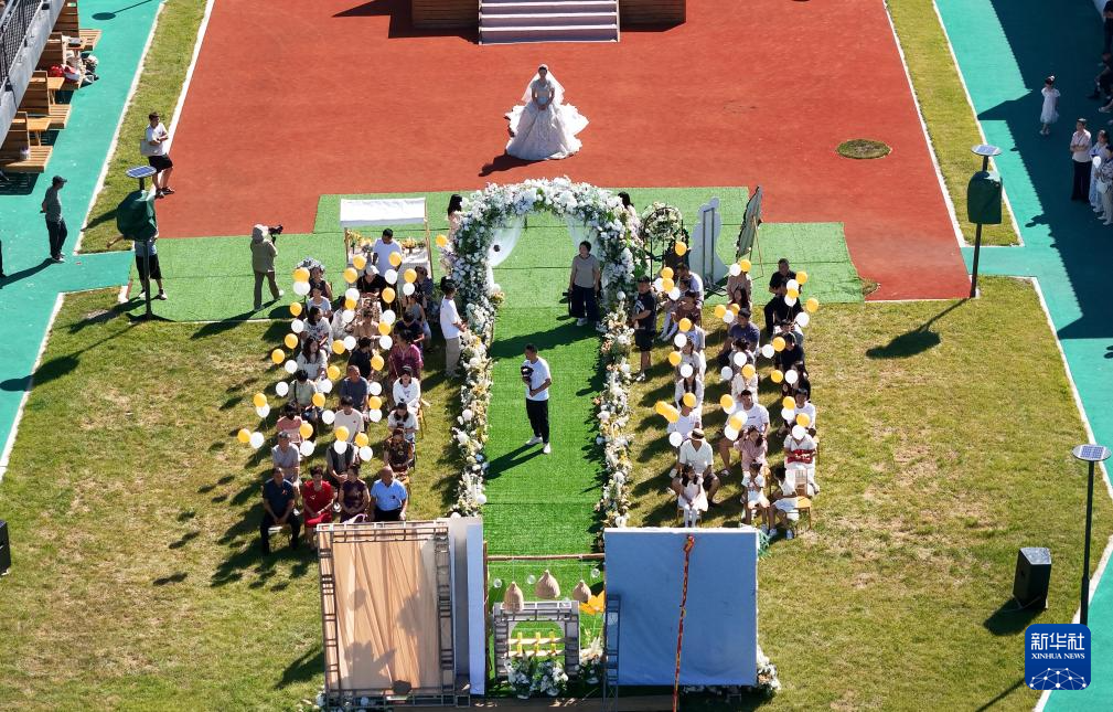 8月2日,嘉荫县向阳乡雪水温村鱼米乡里民宿在举行室外婚礼(无人机照片)。
