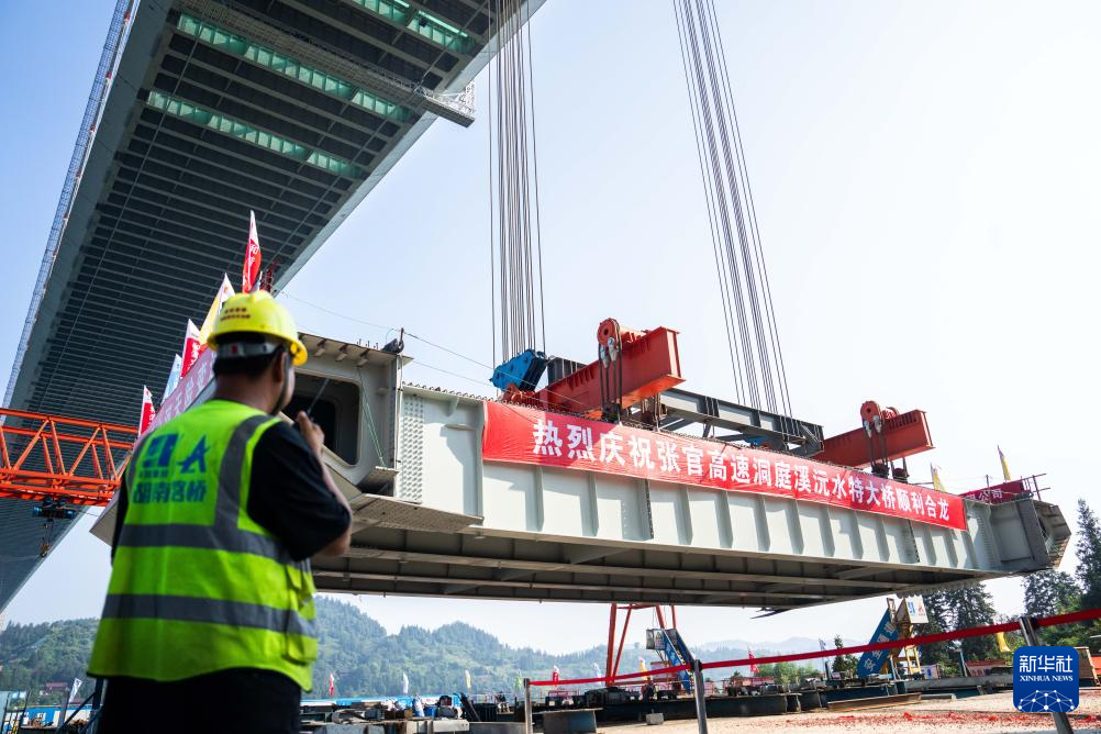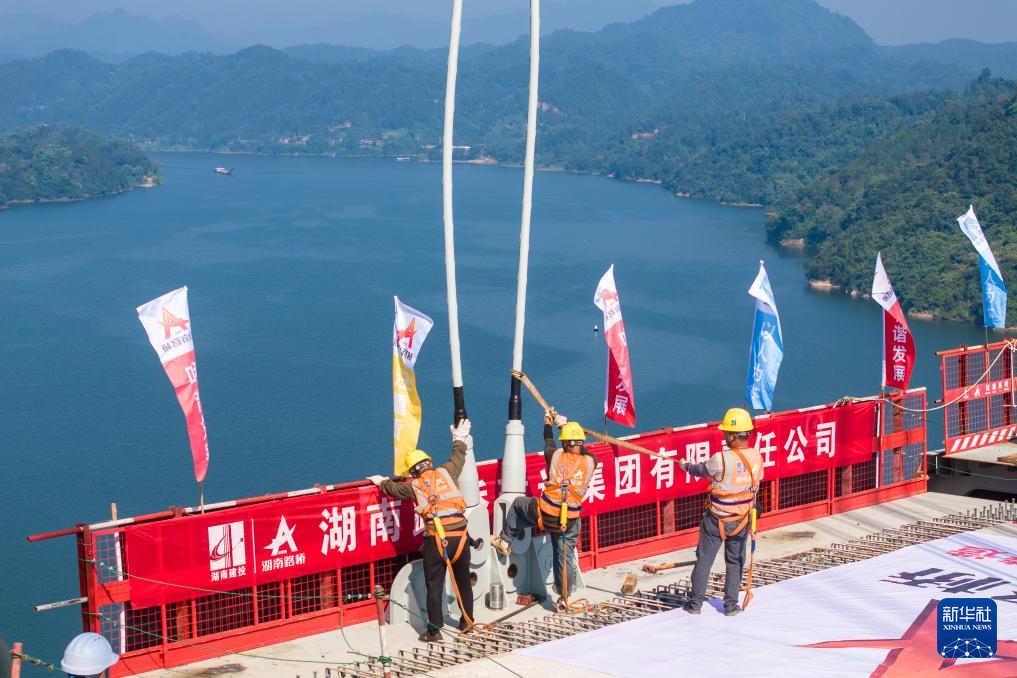 8月3日,在张官高速洞庭溪沅水特大桥施工现场,工人在固定刚被提升的钢混结合梁。