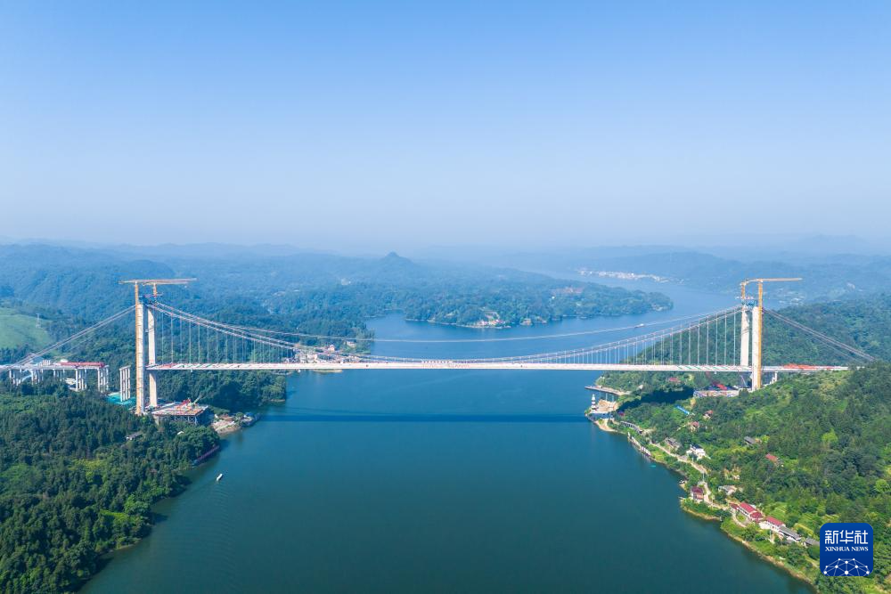 这是8月3日在怀化市沅陵县拍摄的施工中的张官高速洞庭溪沅水特大桥(无人机照片)。