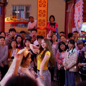 7月31日,在新疆伊犁哈萨克自治州特克斯县八卦城的“八卦城之夜”市集,游客在欣赏民族舞蹈表演。