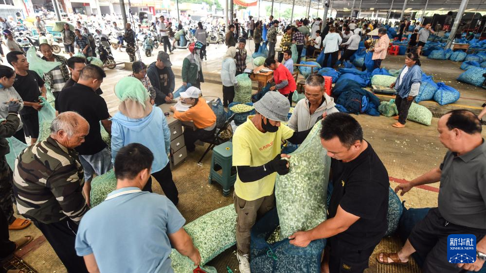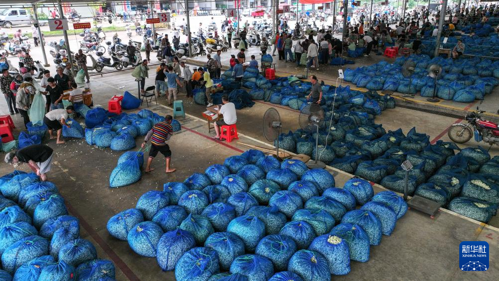7月31日,茶农在横州市石井茉莉花交易市场售卖当天采摘的茉莉花(无人机照片)。