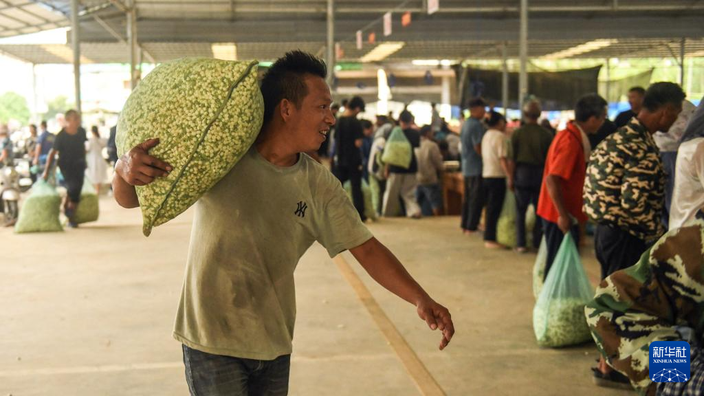 7月31日,一位茶农肩扛当日采摘的茉莉花在石井茉莉花交易市场售卖。