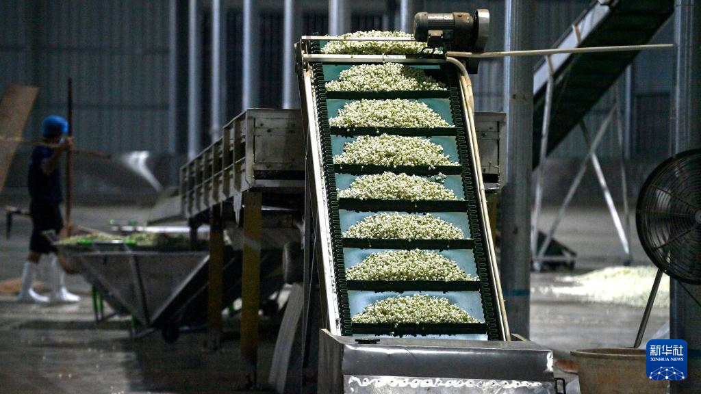 7月31日,一名工人在收集生产线上筛选的茉莉花。