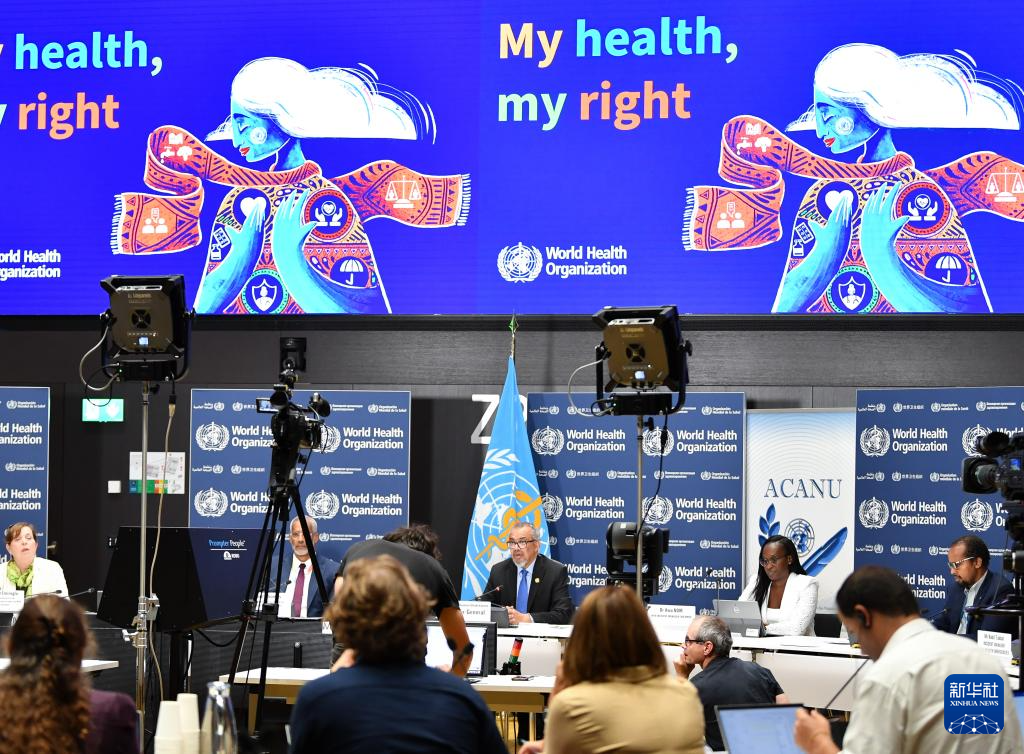 8月7日,在瑞士日内瓦世卫组织总部,世界卫生组织总干事谭德塞(中)在记者会上讲话。