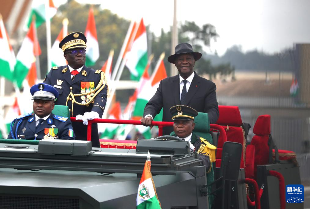 8月7日,在科特迪瓦布瓦凯,科特迪瓦总统瓦塔拉(前中)出席独立日阅兵典礼。