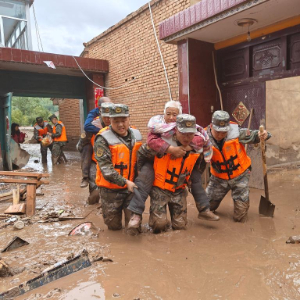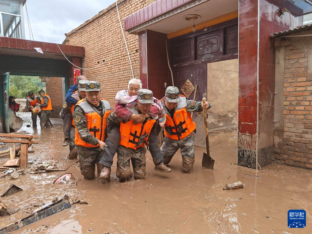 8月8日,武警甘肃总队机动支队官兵在兰州市榆中县城关镇兴隆山村转移被困群众。
