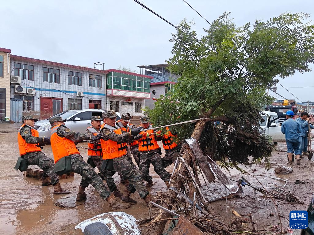8月8日,武警甘肃总队机动支队官兵在兰州市榆中县城关镇兴隆山村挪移损毁树木。