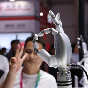8月8日,观众在2025世界机器人大会上观看展示的一款灵巧手。