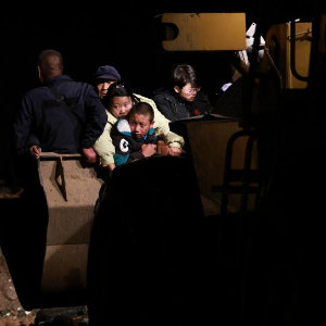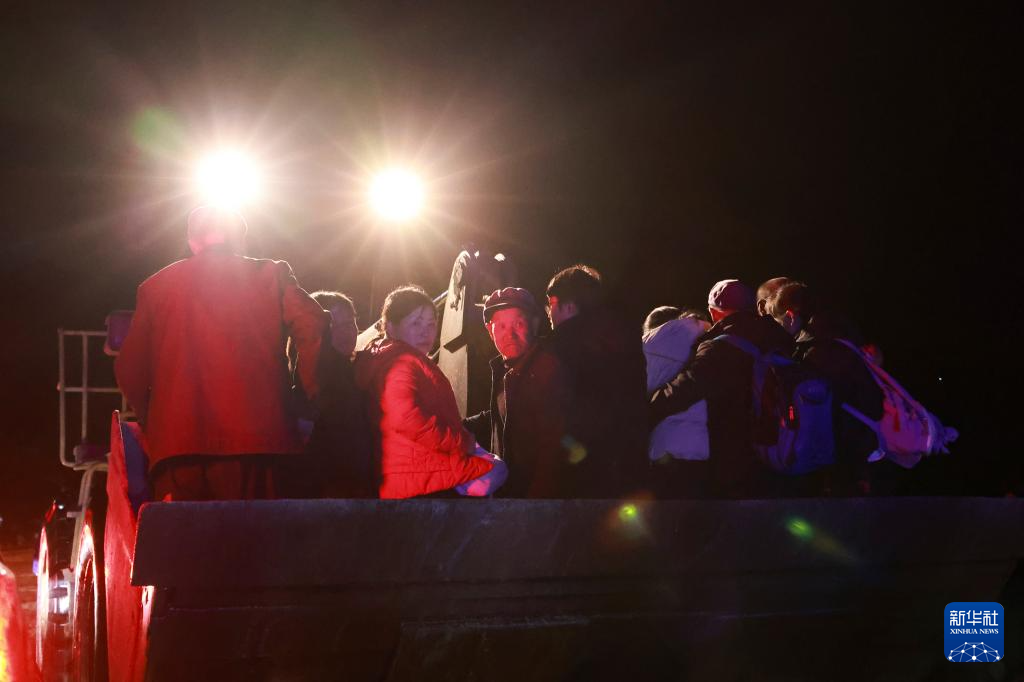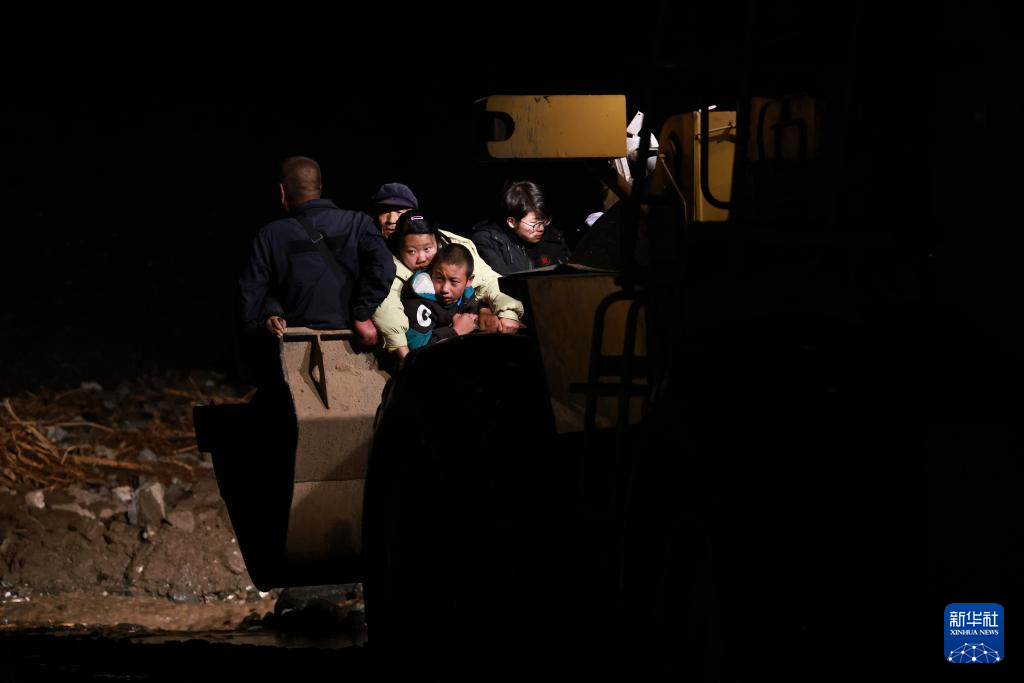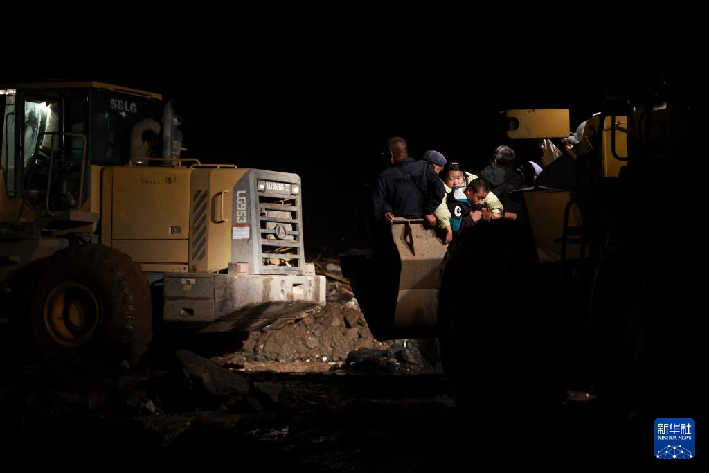 8月8日晚,在榆中县马坡乡马莲滩村,救援人员驾驶装载机转移受灾群众。
