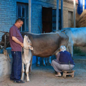 在位于新疆昭苏县萨尔阔布乡的母亲家中,阿曼吐尔·伊沙木丁陪母亲挤牛奶(7月20日摄)。
