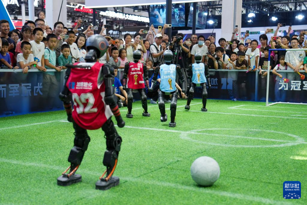 在世界机器人大会展馆内,观众在加速进化公司展台观看人形机器人足球赛演示(8月11日摄)。