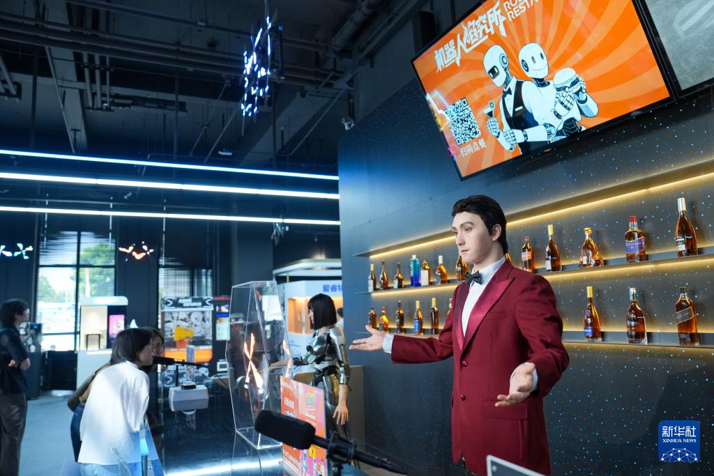 在位于北京经开区的“机器人焰究所”主题餐厅内,一个迎宾人形机器人在跟顾客互动(8月6日摄)。