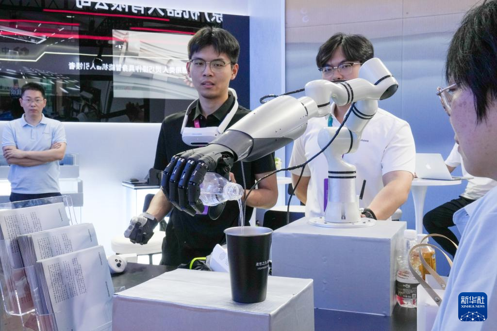 在世界机器人大会展馆内,一款人形机器人灵巧手产品进行功能展示(8月11日摄)。