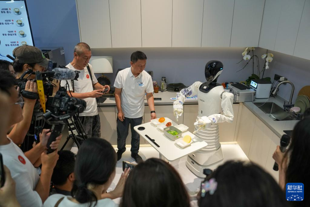 在位于北京经开区机器人大世界的全球首个具身智能机器人4S店(ROBOT MALL)内,观众在观看一款机器人的厨艺表演(8月6日摄)。