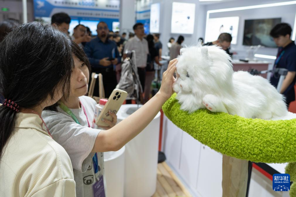 在世界机器人大会展馆内,观众与一款机器宠物互动(8月8日摄)。