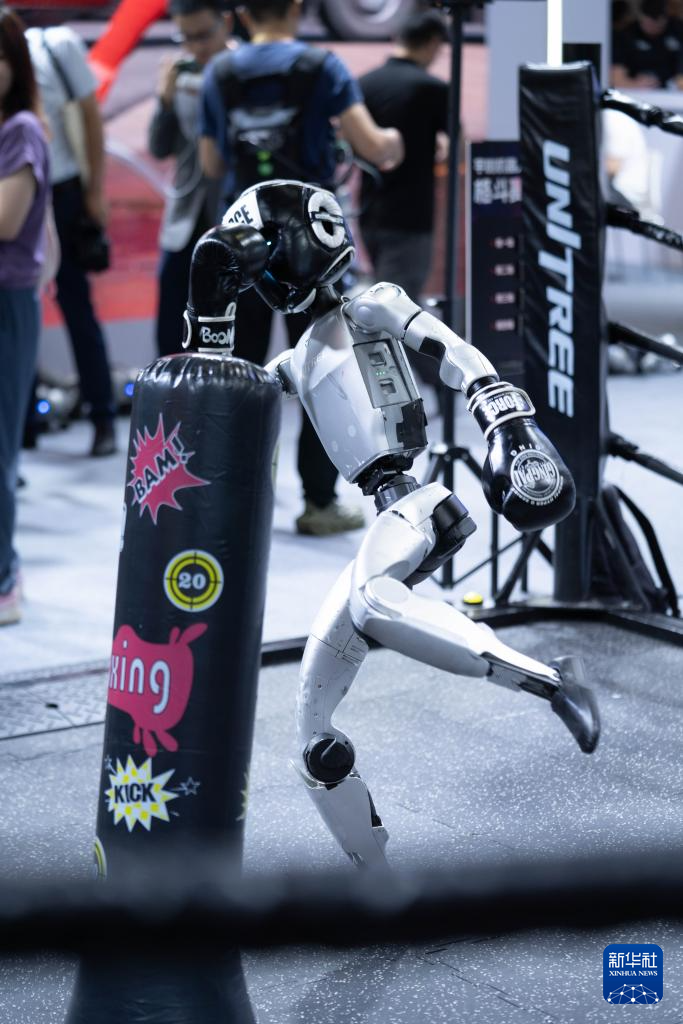 在世界机器人大会展馆内,一款宇树机器人在进行拳击热身(8月8日摄)。