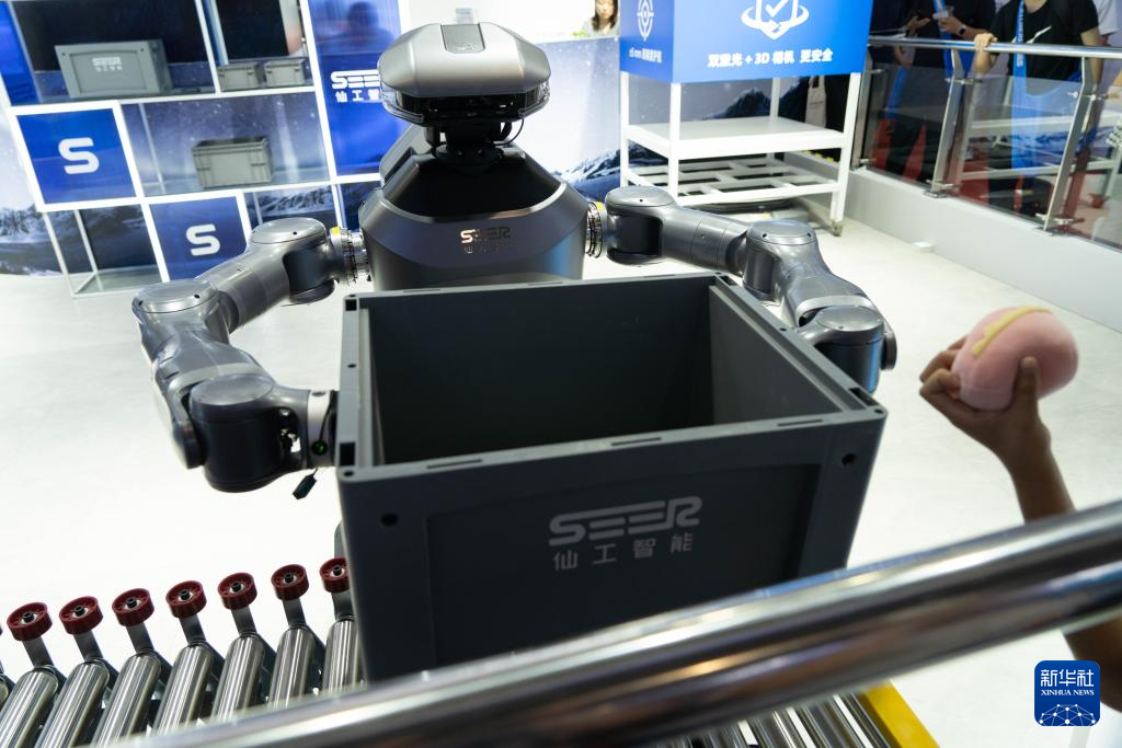在世界机器人大会展馆内,一款机器人在进行抓取物品功能展示(8月8日摄)。