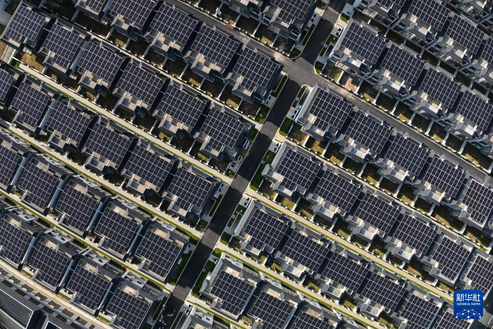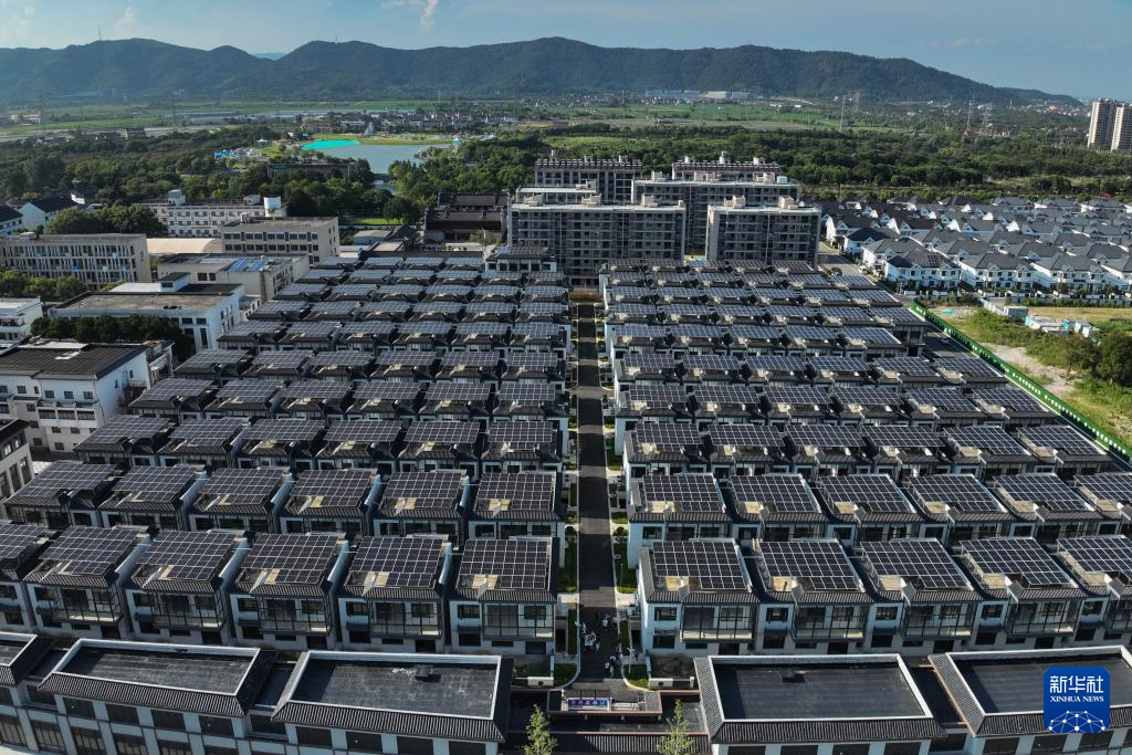 8月12日拍摄的宁波奉化萧王庙街道滕头未来社区屋顶分布式光伏发电项目(无人机照片)。