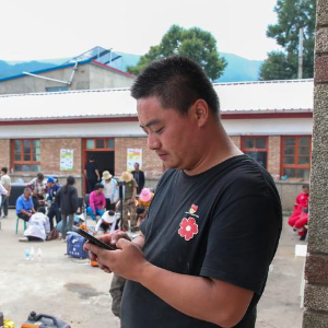 8月10日,在榆中县马坡乡上庄村临时安置点,村党支部书记陈万凯查看手机信息。