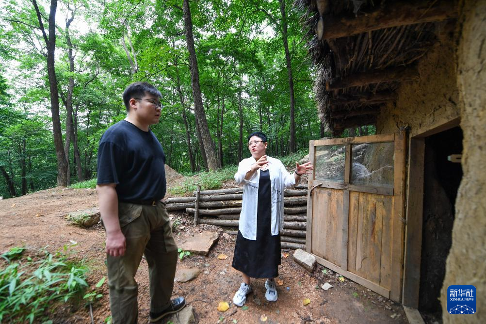 8月11日,在位于吉林磐石的红石砬子抗日根据地遗址,磐石市抗日斗争纪念馆馆长李秋虹(左)向马铖明介绍抗联历史。