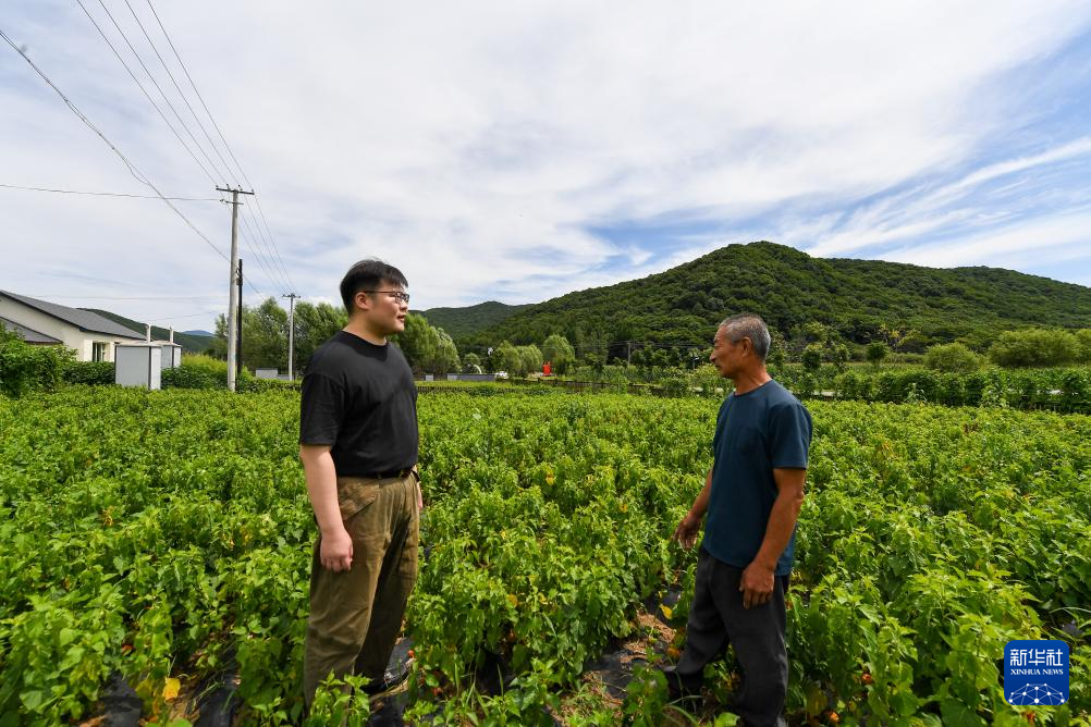 8月11日,在磐石市官马新村,马铖明(左)和村民查看红菇娘长势。